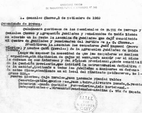Culminando gestiones de las seccionales de FATRE de Dorrego y Gonzales Chaves y Agrupación Jubilados y pensionados de Bahía Blanca se efectuó en la fecha la Asamblea de Jubilados que dejó constituido el Centro de Jubilados y pensionados del Partido de A. G. Chaves.