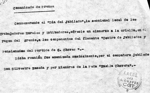 Conmemorando el “Día del Jubilado”, la seccional local de los Trabajadores Rurales y Estibadores, ofreció un almuerzo a la criolla en el Fogón del gremio, a los componentes del flamante “Centro de Jubilados y pensionados del partido de G. Chaves.