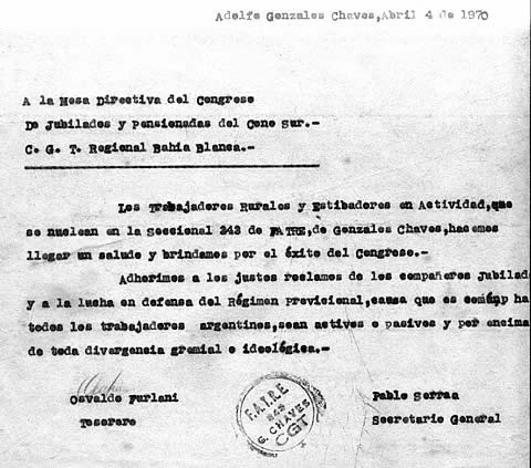 El 4 de abril de 1970, por primera vez asiste el Centro a un Congreso de Jubilados en Bahía Blanca. Lo representaron doña Amelina Conti Vda. de Zapata y don Juan Díaz Dos Santos, los Estibadores de Chaves solventaron los gastos y mandaron ésta nota de adhesión.